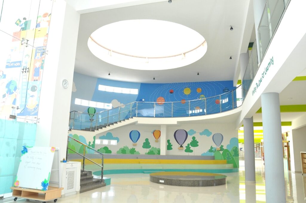 In our effort to make education multi-dimensional, beyond the four walls of a classroom, we at SVIS, Bangalore have a large amphitheatre to host various academic and extracurricular activities. The generous space with a large performance stage surrounded by ascending seats and modern designs makes it the perfect venue for activities and events. Well-ventilated and equipped with modern projection and audio systems with access to the internet, it is thoughtfully planned to inspire a learning experience and encourage participation in academic and cultural activities. The amphitheatre as a circulation area has been designed as an area open for Morning Assembly, socializing, where students can study and do homework alone, or at the same time study or socially interact, make little speeches, drink and eat something, in little groups. Students prefer the stairs of the amphitheatre, because they are more comfortable and not obliged to be formal unlike the classroom. Students are more social and feel free and relaxed here. This area is most prominent in the school and called the heart of the school where informal activities can be performed. Thus the amphitheater serves as a public space for learning, teaching, self-studying, eating, resting, playing, talk shows and so on. The stairs are located between the ground floor and first floor in the central area,providing visual communication between the entry and all the other floors.